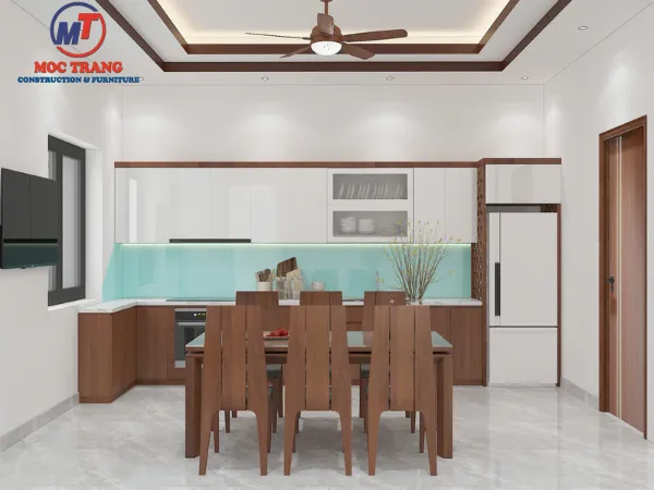 Phòng bếp và phòng ăn: Liền kề với phòng khách là khu vực bếp và phòng ăn. Bếp có thể được thiết kế theo dạng chữ L. Phòng ăn sẽ được bố trí một bàn gỗ hương, tạo cảm giác ấm cúng cho bữa ăn gia đình.