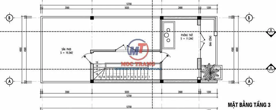 Công năng tầng 3 mẫu thiết kế nhà 3 tầng 5x12m bao gồm phòng thờ, sân phơi, 1 phòng ngủ nhỏ và sân thượng rộng rãi. Khoảng sân vườn được thiết kế tương đối rộng. Khu vực này có thể tận dụng làm nơi thư giãn giải trí cho gia đình.