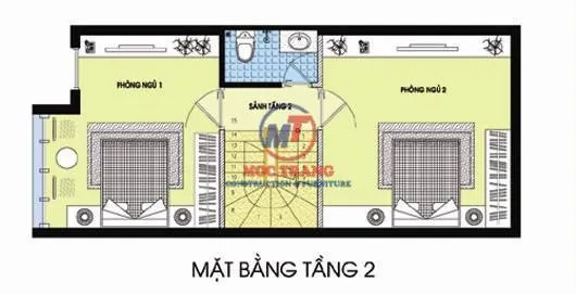 Tầng 2 có thiết kế 2 phòng ngủ chính. Phòng ngủ master có diện tích lớn hơn. Ngoài ra nội thất đầy đủ tiện nghi với phòng vệ sinh riêng đảm bảo sự riêng tư. Có ban công bên ngoài phù hợp cho việc nghỉ ngơi, thư giãn. Phòng ngủ nhỏ hơn dành cho các con, được bố trí nội thất khoa học. Ngoài ra còn có một nhà vệ sinh chung đặt đối diện cầu thang.