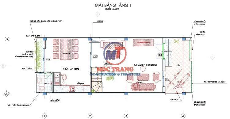 Tầng 1 ngôi nhà được bố trí nơi để xe tiện ích. Tiếp theo là phòng khách rộng rãi, phục vụ mục đích sinh hoạt chung của gia đình một cách thoải mái. Ngoài ra, đây cũng là nơi tiếp khách tuyệt vời. Tiếp sau là phòng bếp ăn ngăn cách với phòng khách bằng hệ thống lam giàu tính thẩm mỹ. Nhà vệ sinh chung được khéo léo đặt dưới cầu thang giúp tiết kiệm không gian hiệu quả.