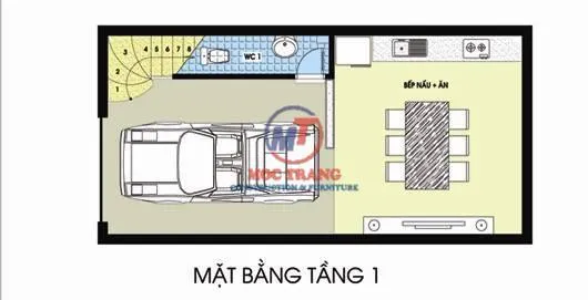 Tầng 1 có gara đặt liền kề với khu vực bếp nấu + ăn của gia đình. Cách phân bổ mặt bằng tương tự với các không gian nhà phố phổ biến hiện nay. Cầu thang đặt ở góc nhà . Nhà vệ sinh được đặt ở cạnh cầu thang nhằm tiết kiệm diện tích.