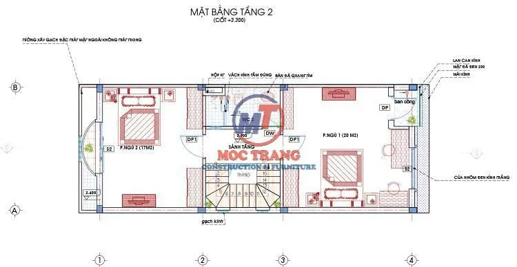 Mặt bằng tầng 2 được bố trí hai phòng ngủ và một vệ sinh chung. Phòng ngủ 1 tận dụng được ánh sáng từ mặt tiền kính, phòng ngủ 2 đối lưu không khí qua khoảng thông tầng phía dưới.
