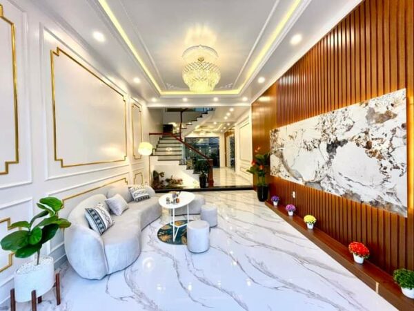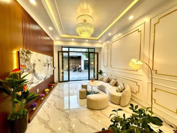 Nội thất sang trọng: Ngôi nhà được trang trí với nội thất cao cấp và đẳng cấp. Sàn gỗ, đèn chùm, bậc thang gỗ và các chi tiết trang trí tinh tế mang đến không gian sống sang trọng và ấm cúng.