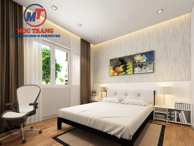 Trong mẫu thiết kế nhà 4 tầng 60m2 tông màu trắng sáng kết hợp nâu nhạt được sử dụng mang lại sự yên bình, ấm áp cho không gian nghỉ ngơi.