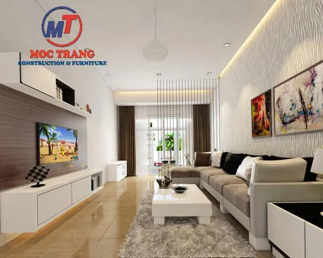 Khu vực phòng khách thoáng mát, trẻ trung hiện đại với tông màu trắng sữa chủ đạo. Vì mặt tiền nhà không quá rộng, nên khi lên phương án thiết kế các KTS bố trí bộ ghế sofa dài chạy sát kết hợp với bàn trà nhỏ xinh. Mảng tường phía sau được dán giấy dán tường hoa văn nhẹ nhàng, duyên dáng. Từ đó làm nổi bật hai bức tranh nghệ thuật đầy sắc màu.