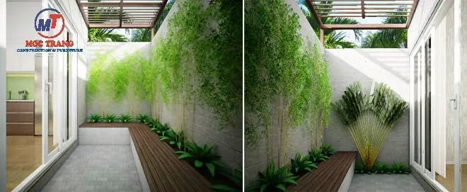 Sân sau được thiết kế như một nơi nghỉ ngơi, thư giãn lý tưởng với tre trúc, cây cảnh cảnh và dãy ghế dài bằng gỗ.