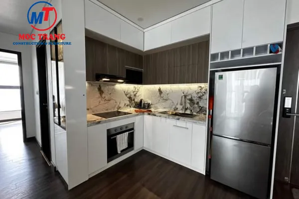 Các vật liệu sử dụng trong bếp của căn hộ chung cư Hoàng Huy đều là những loại cao cấp và có độ bền cao. Chất liệu gỗ tự nhiên và đá granite được sử dụng để tạo nên bàn làm việc và tủ bếp. Ngoài ra, các thiết bị như máy hút mùi và lò vi sóng cũng được lắp đặt để mang lại sự tiện nghi và hiện đại cho bếp.